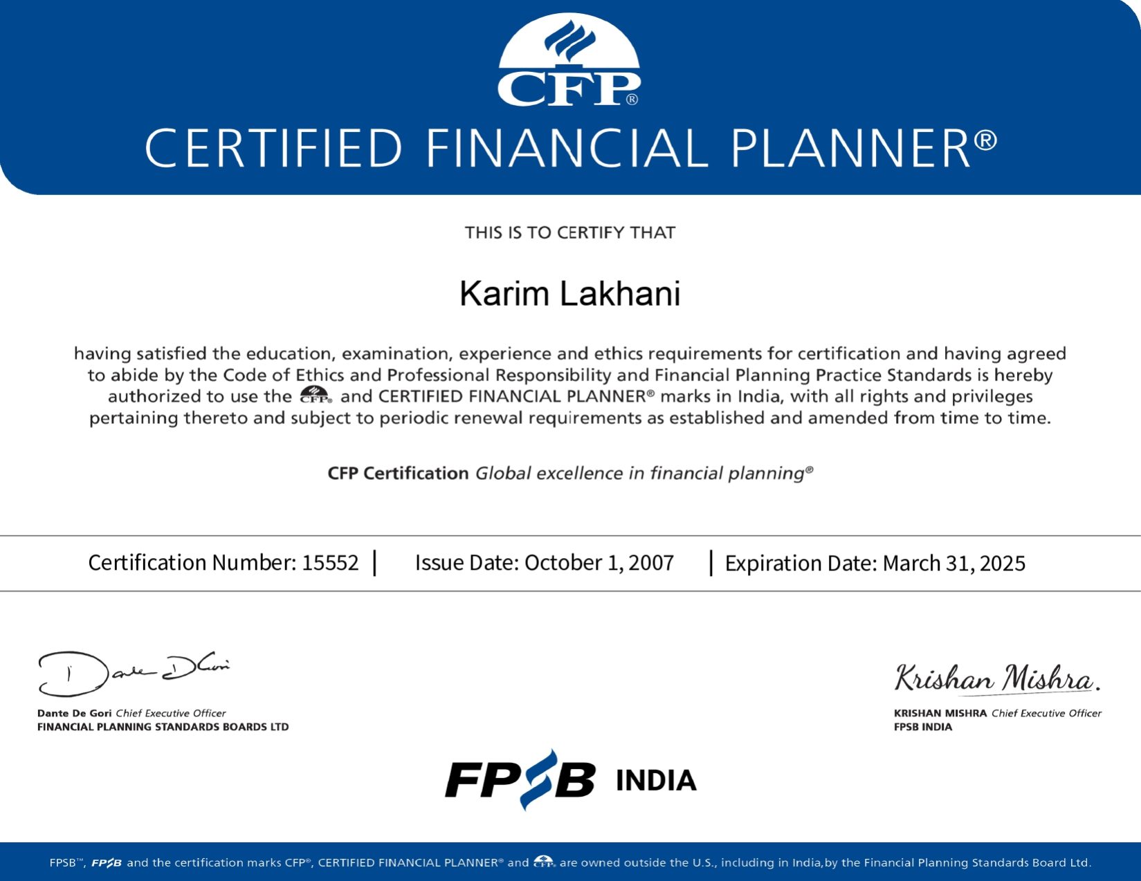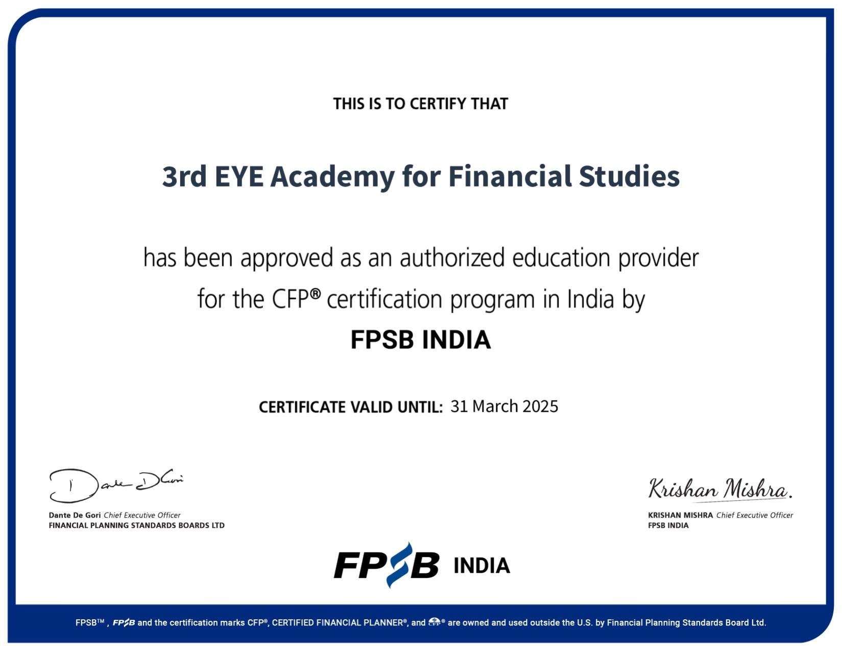 3rd EYE Academy for Financial Studies established in the year 2015 by Mr.Karim Lakhani CFP CTEP. Having association and training at various institutes, Mr.Karim felt a need to start an institute which should not have constraints to be time bound to teach and deliver the subject in a true sense with practical approach. 3rd EYE Academy is a subsidiary sister concern of 3rd EYE Consultants having more than 13 years of presence in finance domain. Promoters of the company possesses various expertise and wide experience in the Wealth Management, Investments, Insurance, Estate Advisory. 3rd EYE Academy has been recognised and also is a training partner for many corporates like HDFC AMC, ICICI AMC, and American Academy for Financial Management, Financial Planning Standards Board India and many more.